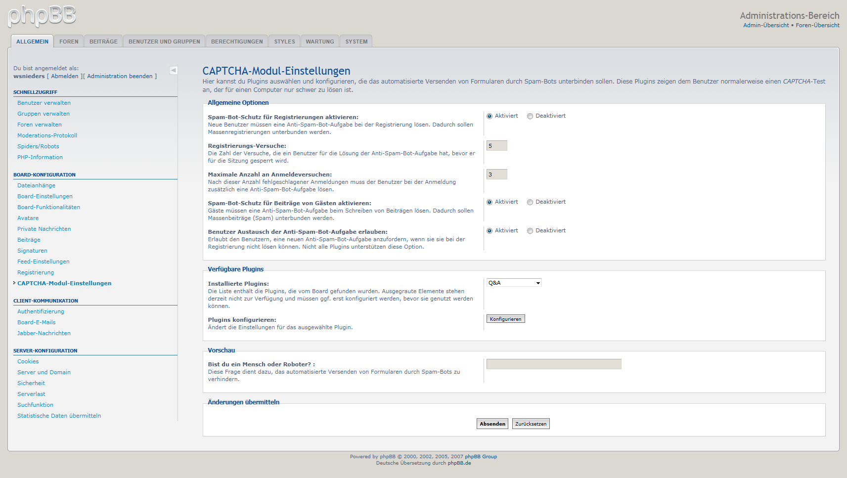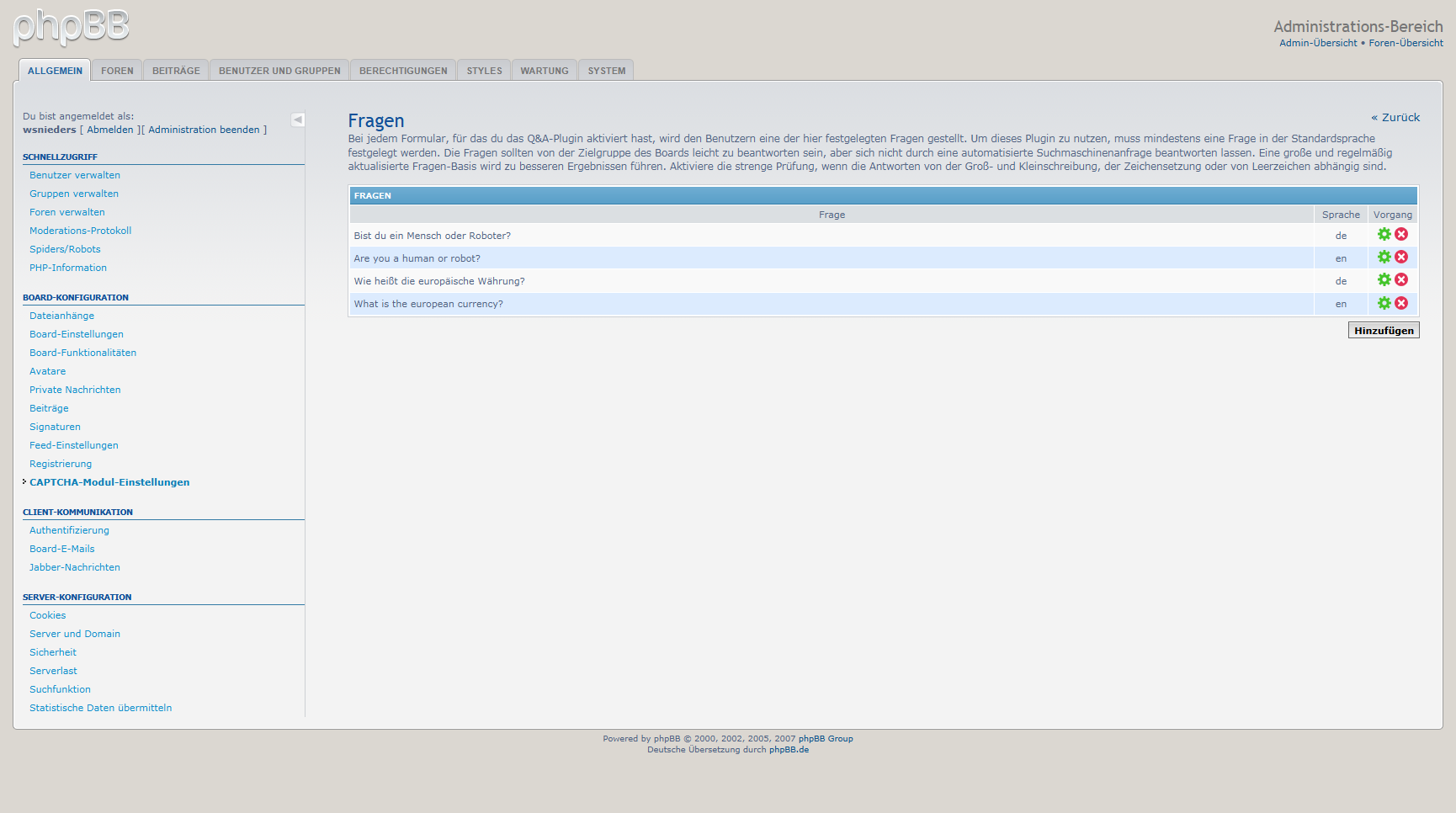 Im Administrationsbereich der Forensoftware kann man unter dem Register "Allgemein" --> Menüpunkt "CAPTCHA-Modul-Einstellungen" den Fragen- und Antworten-Katalog aktivieren. Dazu muss unter "Installierte Plugins:" im Dropdown-Menü "Q&A" ausgewählt werden. (