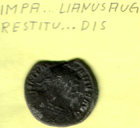 Die Münze aus dem -hoffentlich- beiliegenden Scan glaube ich als einen Antoninian des Aurelianus identifiziert zu haben, möglicherweise RIC 289 oder 298:
