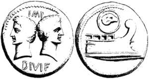 Av der Kopf des Julius Caesar und des Octavians nur noch schwer erkennbar. Die Rückseite mit der Schiffsprora und dem Kreisgebilde darüber". Mögliche Prägeorte Lyon oder Vienne.